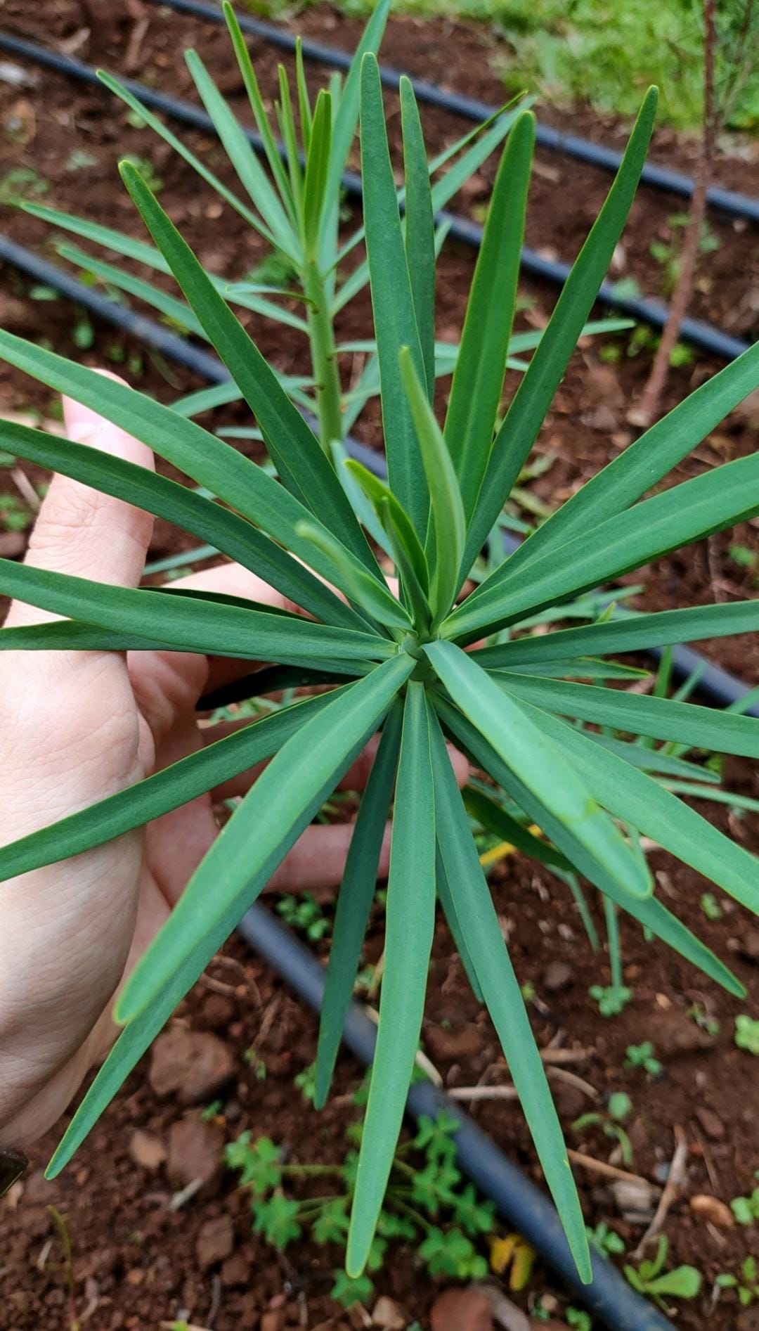 Descripción: Arbusto con un tronco principal bien desarrollado de color gris oscuro, de hasta 2 m de altura. Hojas arrosetadas en el ápice de las ramas, linear-lanceoladas, agudas, 13-40 veces más largas que anchas, verdes, glabras. Con látex tóxico. Las inflorescencias son pseudoumbelas con unos 2-7 radios que suelen bifurcarse. Flores con brácteas (bajo los ciatios) ovadas a elípticas, agudas, amarillas, se caen en la fructificación; nectarios ovados sin cuernecillos pero dentados. Los frutos son cápsulas tricocas de color rojizo.